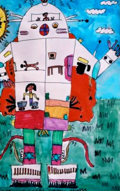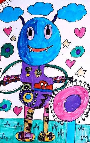 表現:畫機器人時~內部呈現出不同層次及功能,用透明式手法表現,外形新穎內部科技盡量創新.....趣味.....生動.....天馬行空。
