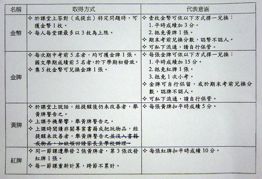 昨天晚上正式讓金幣、金牌和同學們見面,大多數的同學都覺得這是個不錯的規定。不過學生也提供了一些想法,例如上課期間上廁所要不要舉黃牌?作業A+能不能換金幣?幫老師東西有沒有金幣?……諸如此類。反正剛開始進行,我也不確定這些規定是否都適用,我會視各班狀況細部調整,只要能達到上述的目的,我都會從善如流的。