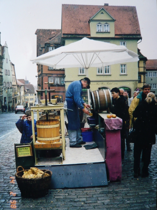 廣場中一個賣蘋果汁的小攤,也吸引了遊客的注意,原因是老闆利用古法來壓榨蘋果汁。只見從木桶裡所流出的一杯杯金黃、質純香甜的蘋果汁,大杯四馬克、小杯二馬克,若您到此地一遊,不妨嘗嘗看。