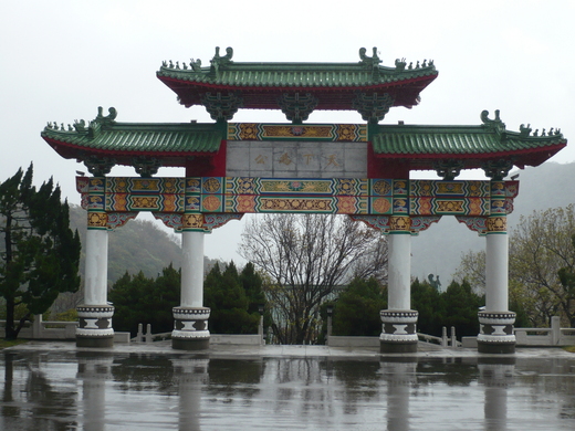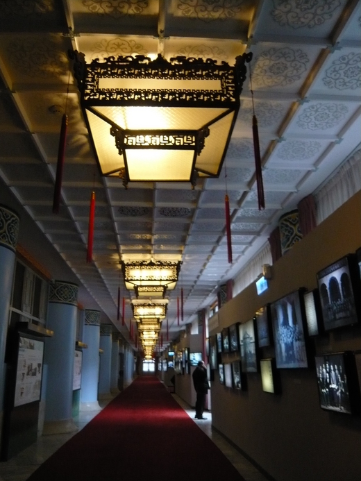 圖二、中山樓大門面對的牌樓後方,可以明顯看到兩座山脈的交會處,而正中的那棵因為冬天只剩枯枝的大樹,就是傳說中蔣中正親手栽植以鎮住老國代的楓香。圖三、中山樓側的長廊,牆上放滿國民大會的歷史。