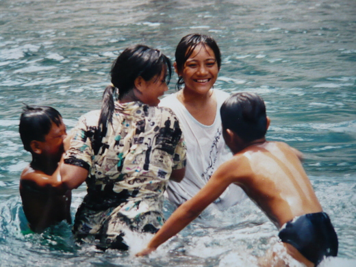 豐年祭後,我們也到村子走走,看到還有些傳統的石板屋,而村落一旁則是南隘寮溪,傳來陣陣孩童的歡聲笑語,原來在清澈的溪水中,形成一個自然的深潭,潭旁有塊大石頭,跳台上聚滿大大小小的原住民小孩,爭先恐後跳入水中,完全不顧溪水的冷洌,讓我驚嘆好個「世外桃源」。