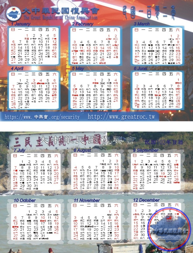 歡迎索取大中華民國復興會的102年桌曆、年曆卡