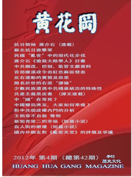 本期雜誌,發表了袁定華先生的“抗日領袖蔣介石”(連載),行易先生的“蘇北抗日遊記軍”,秦暉先生的“民國‘亂世’中的現代化步伐”,張東園先生的“蔣介石《搶救大陸學人》計畫”和孫無先生的“首部廢漢政令由紅色蘇區發表” 等現代史反思佳作,以繼續推動當代中國人民的歷史反思運動。因為胡錦濤的共產黨早已在無所不用其極地反撲人民的歷史反思,用盡陰險的、甚至是所謂藝術的手段,來詆毀和消泯人民反思的成就;共產黨的“嫡傳王儲”剛剛上臺,就立刻美化和歌唱起他們的“共產革命家”父母來了,連多年來已經從教科書裏悄然消失的“俄屬中華蘇維埃共和國”——這個共產黨的“光輝賣國歷程”,竟又突然地高高屹立在江西瑞金那個象徵著共產黨“輝煌党國歷史”的“國鼎”頂端,甚至被封為中共的“第一大革命歷程”。知恥近乎勇,不知恥者何以知羞乎!時至今日,還要將毛澤東前三十年的血腥統治與中共後三十年腐敗腐爛的專制改良“接軌”,以強調共產黨統治的一致性和連續性,無非是“習李”們一邊要高喊改革、一邊又要“飲鴆止渴”而已。