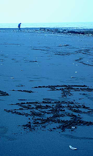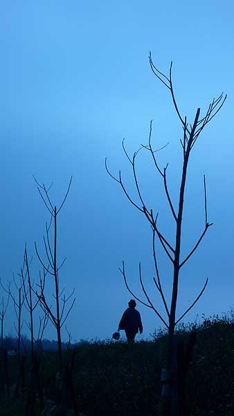 永在一個濕雨天氣裡,一個人___走在堤防岸邊上