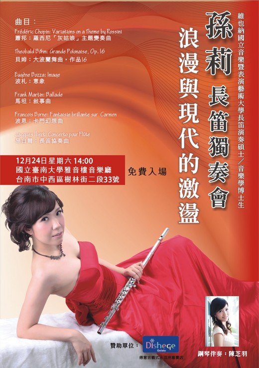 2011/12/24 孫莉長笛獨奏會 孫莉出生於台南水交社,曾就讀水交社幼稚園,及志開國小三年級,之後考入永福國小音樂班,畢業於永福國小和大成國中音樂班。參加全國高中音樂班甄試,名列前茅錄取省立...