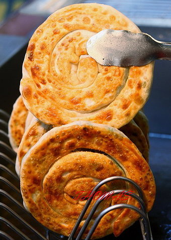 試吃後,豬仔最愛「手工蝸牛餅」25元:跟坊間蔥油餅不同的「手工鍋牛餅」,曾經一天賣出300張。把或著蔥的水麵揉成長條狀,再捲成一大圈,做成鍋牛般的可愛形狀。因為油脂少,較蔥油餅多了分清爽,吃來外酥內軟,帶有淡雅蔥花餘韻。