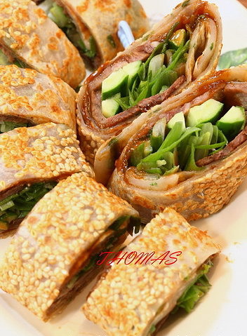 胡姐推薦的「大餅捲牛肉」70元:小攤子賣著手工餅類;胡天蘭推薦的「大餅捲牛肉」,將和著蔥花的麵糰現場桿開後,抹上蛋液、灑上芝麻,增加麵皮的滑嫩香氣,再入鍋煎至金黃焦脆。起鍋後,抹上甜麵醬、排入大量的小黃瓜絲、蔥段與滷牛腱。胡天蘭說「片得很薄、很費刀工的牛肉,滷得很香;不像一般牛肉捲餅的粗糙,也不會造成牙齒與胃的負擔。」