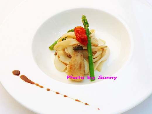 拉起麵條一嚐,天啊!這居然不是義大利麵,這是「杏~鮑~菇」做成的「假麵條」。主廚用刀削麵的手法,將杏鮑菇刨成麵條狀,利用台灣杏鮑菇獨有的甜度與Q勁,再以特級初榨橄欖油清炒,搭配一朵杏鮑菇、蘆筍跟番茄,看起來是義大利麵,吃入口卻是香菇,真讓人大感驚喜。