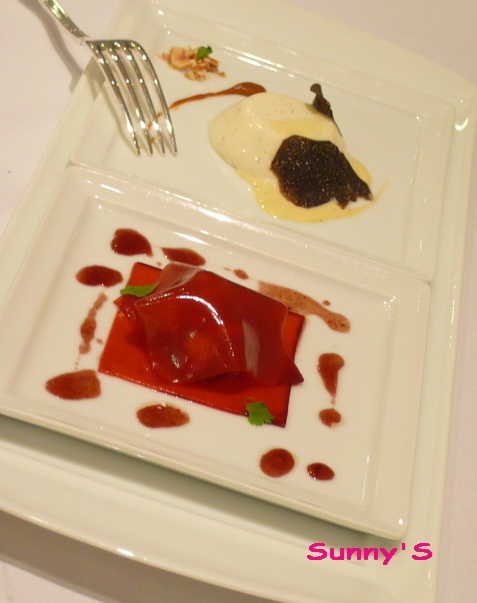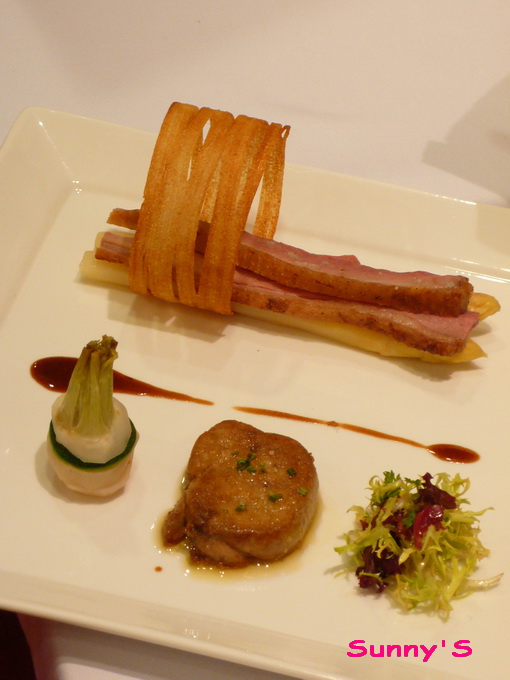 煎烤鵝與鴨肝佐紫蘆筍、黑醋野苺醬汁:碩大的紫蘆筍口感極為鮮嫩,搭配烤鵝肉與鴨肝。