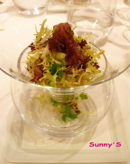 煎深海魚佐澳洲蒜苗與龍蝦醬汁:來自澳洲的有機蒜苗,嗆辣中帶甜味,搭配溫潤的煎鱸魚,恰到好處。