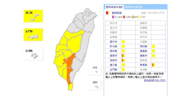 中央氣象局今天上午對南高屏等11縣市發布豪雨、大雨特報。(圖擷取自氣象局)
