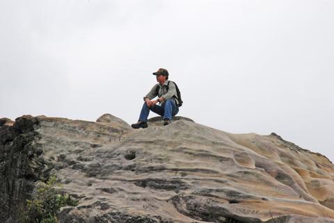 一顆黃白色的大石頭,躺在山頂上,像條掛在山頂上的船,就是這座山的名字軍艦岩。