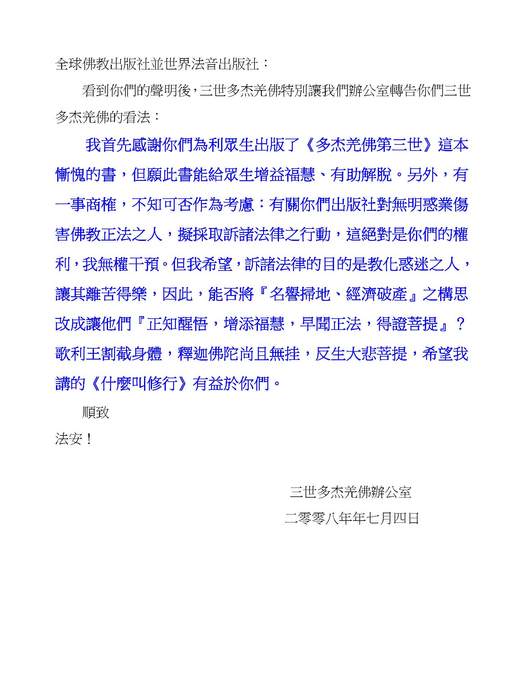 自我們出版社的聯合聲明見報以後,今天我們收到了三世多杰羌佛辦公室轉來的三世多杰羌佛就此事的開示,現在我們將此來信公告於世。