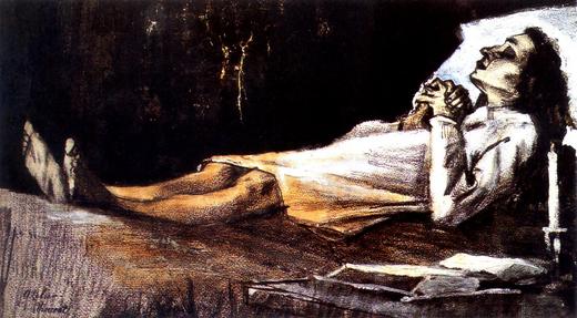 這個時候的梵谷從神職工作轉變成藝術家,面臨家庭關係的變化,可是他毅然決然走向這條不被世人看好的一途,從他的相關作品呈現灰暗,人物表情黯淡、衰老的畫風裡,傳達的幾乎都是「不被世人了解的孤獨」,尤其當我看到了一幅「臨終床上的女人」,內心非常的震撼!也許依現在畫家們的寫實畫風裡,梵谷的作品稱不上精緻,可是他表現出來的,是生命已經走到盡頭,女人雖然雙手合十,可是我感覺得是她企圖以宗教的藉慰,來減緩對死亡的恐懼,以前修一門藝術的課程,老師曾經提到藝術家要表達的不只是畫,而是藉由畫中的世界,來與觀賞畫的人做心靈上的溝通,而此時的我內心非常激動,閉上眼睛時,似乎可以看到梵谷在跟我講話!(資料來源:http://tw.myblog.yahoo.com/akay082790-10132300kegon/article?mid=14874&sc=1)