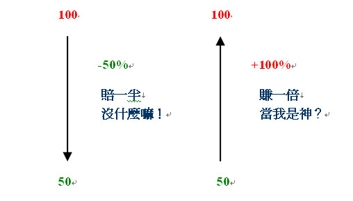 假設100元的成本跌到50元的市價,也許對投資人而言頂多是賠50%,大不了擺著不管,然後一廂情願股票有朝一日漲回101元以上就賣掉;請問各位散戶朋友,從50元再爬回100元的成本,是不是等於一倍的獲利?每年報酬率維持在8%以上就算很了不起了,請問這一倍的獲利我們要怎麼做?這就是為什麼大多數股市老手在強調停損的重要性(解析如附件)