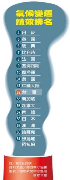 目前台灣平均每人每年碳排放量是11.3噸,遠遠超過聯合國 IPCC AR5的要求:低於2噸。環保團體「德國看守協會」 (Germanwatch)去年公佈氣候變遷績效指排名中,58個國家中台灣排名五十二,被列為「非常糟糕」名單,比泰國、大陸、馬來西亞都差。