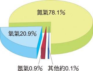 大氣成分包括:78%是氮氣,21%是氧氣,其他氣體只佔1%(其中氬佔0.93%、二氧化碳佔0.039%、其他稀有氣體共同佔0.031%)。