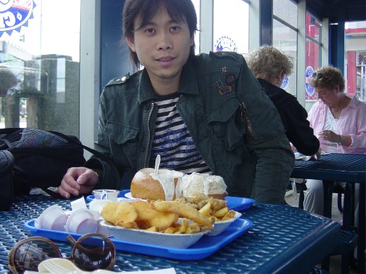 端著兩大盤的食物 找了個沒有海鷗的位置坐下