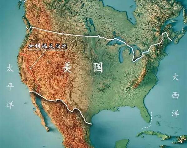 加州西鄰太平洋,西部為高大的落基山脈和海岸山脈等,內陸多乾旱的盆地和小湖泊。加州北鄰俄勒岡州,東鄰內華達州和亞利桑那州,南接墨西哥下加福尼亞半島。加州地形上,東有內華達山,西有海岸山脈,中間是中央盆地。來自東太平洋沿岸的暖濕空氣,被海岸山脈阻擋,只有北部冬季濕潤多雨,夏季炎熱乾燥。加州南部生產生活地區,人口占三分之二,卻乾旱少雨,荒漠眾多。