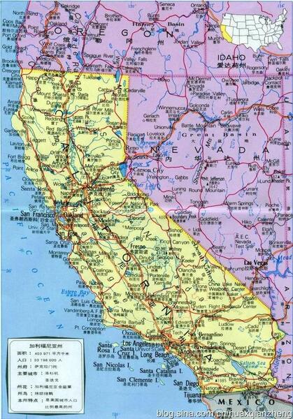 加利福尼亞州,州府所在地是薩克拉門托,主要大城市,有洛杉磯、舊金山、聖地亞哥(聖迭戈)、聖克拉拉、費里蒙特、聖塔巴巴拉市、聖何塞、聖蓋博、庫卡蒙格牧場等。加州缺水嚴重,境內沒有大河長河。只有薩克拉門托河,全長615公里,流域面積7萬多平公公里。聖華金河,全長530公里,流域面積8.3萬平方公里。