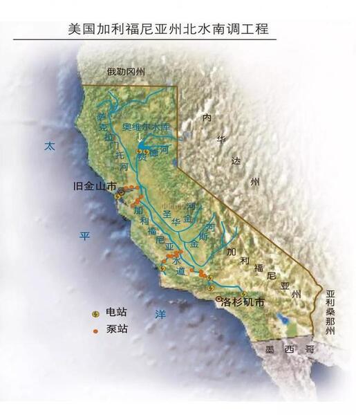 美國加利福尼亞州中央河谷水利工程,穿越美國東西部大鐵路和70號公路(移調)、北水南調工程,就是把北方的充足水源,運從南方的乾旱荒漠地區。「加州中央河谷北水南調工程」,全長約900多公里,調水總揚程1151米,年調水量52億立方米。整個北水南調一共途經28個水庫和大壩,22個抽水站和一些水電站。