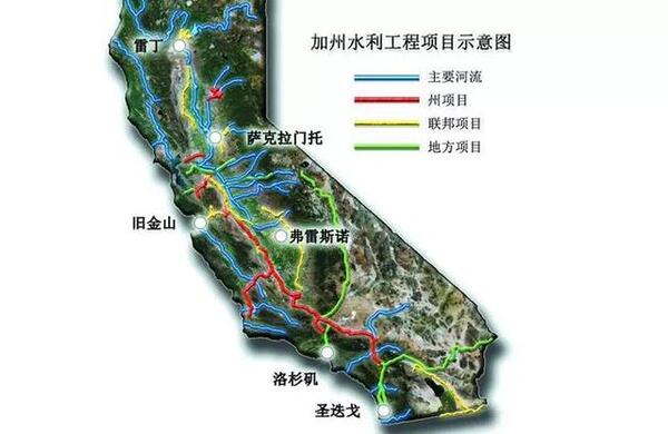 加利福尼亞州,北部大部分屬於地中海氣候,南部屬於熱帶沙漠氣候夏季乾燥少雨,冬季濕潤多雪。北部降水可達2000毫米~3000毫米,南部平均只有50毫米~100毫米左右,″死亡谷」曾經連續7天,一滴雨未下。隨著人口不斷增長,只好興修水利工程。一開始加州先從附近的科羅拉多河下游取水,後來還是不夠用,又繼續在北部興建了一些小型水庫和乾渠。