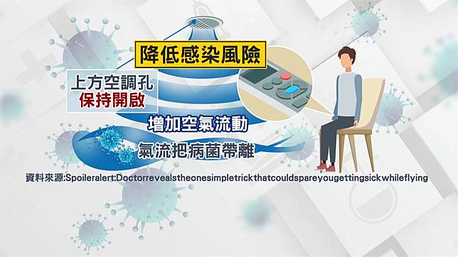 COVID-19防疫解封,大家到國外出差、旅遊機會大增,讓傳染病威脅提高,尤其搭飛機時,處在密閉空間,病菌傳播機率也相對高,國、內外醫師都建議,搭乘飛機時,可讓座位上方空調孔保持開啟,這一個小動作,就能讓感染風險大幅降低。