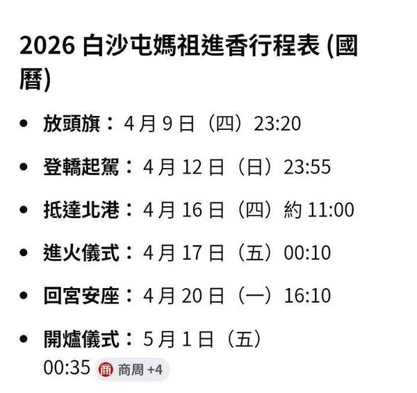 於4月12日(農曆2月26日子時)深夜起駕,至4月20日回宮.