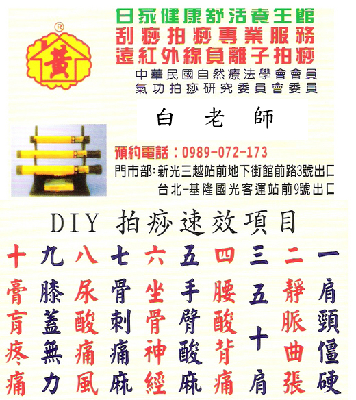 最近去上班又遇到以前擺攤時認識的拍痧師傅〝白忠樹〞老師,所以我那多年的老毛病(肩頸酸痛加腰酸背痛及水腫)又去請白師傅治療,每次三百元。老實說事隔多年,我不太記得拍痧棒的療效,所以,一開始我又抱著半信半疑的態度去試試看,因為那天我的肩膀酸痛到手快舉不起來,但是很神奇的,拍打過第一次後,我的手就可以舉起來了,而且師傅說:只是拍輕鬆(意思是不算拍痧,因為拍痧要擦特製中藥,怕會弄髒我的衣服,所以師傅建議,如需治療,請穿黑色衣服,以免衣物沾上中藥洗不掉),所以第二天我就刻意穿了黑衣黑裙去治療(很多年不穿黑衣了,因為老公不喜歡),一開始白師傅就先問我:「要先治哪裡?」,我楞了一下,白師傅解釋說:「拍痧一次不能拍太久,人會受不了,必須一次一次慢慢來」,所以因為那天腳踵的厲害,所以我說:「就從治水腫吧!」,然後你就看到一個女的在那唉唉叫,因為好痛啊!只聽白師傅一直在那說:「不通則痛,通則不痛...寧可痛一下子,也不要痛一輩子」,然後我看到那超痛的地方,居然浮出像靜脈瘤的東西,有一大陀喔!白師傅說那就是阻塞的現象,我是痛到很想逃開,但一樣的力道,有些地方則完全不會痛呢,也沒有東西浮出來...就這樣,不知到底過了多久,我冒了一身汗,雖然有冷氣吹,邊看著我的腳完全毀容,簡直慘不忍睹...終於,白師傅說:「賜你無罪,好了,趕快去喝溫開水...」,頓時,如釋重負,說也奇怪,腳馬上感到不再僵硬,而且過了一會兒,正常小解了(原本我只要去上班,不知何故,幾乎一整天都可以不用去化妝室,一直要等到我回家),真是太神奇了...