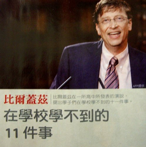 在天下雜誌雙週刊的「海闊天空-教育特刊十週年」中,讀到微軟總裁,也是全世界首富的比爾蓋玆(Bill Gates)在一所高中所發表的演說,他提出了學子們在學校裡學不到的11件事,內心深表感動及贊同。除了立即為同在書房中做功課的我家大小姐導讀外,也想著要和其他相識或不相識的朋友們分享。