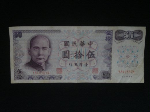 我一看他手裡拿出一張紫藍色紙鈔五十元