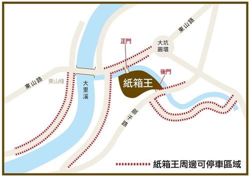 國道一號/由大雅交流道(往台中市的方向)走中清路>左轉文心路>東山路>約20分鐘抵達紙箱王在右邊