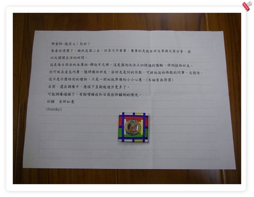 信是來自於久已不見文章的- choeskyi 佛法ㄉ贈禮,相信許多格友都知道她是一位慈悲為懷的人。信的內容主要是恭喜我獲得部落格比賽第二名,並送來了一份禮物。