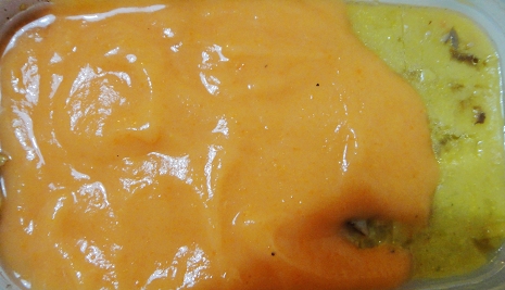 1.昨天習作花椰凍, 今天將花椰菜改為白菜,再用薑黃做成黃色,馬鈴薯與胡蘿蔔一起打成泥,顏色變為橘色, 黃與橘色配在一起還滿協調的.