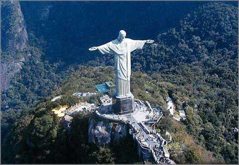 里約熱內盧的耶穌山,山丘位於海拔2310尺,是觀光里約熱內盧的最理想地方,山丘上有一巨型耶穌像。這塑雕像,是巴西著名雕塑家瓦爾·科斯塔及其同伴們,花費了整整45年的時間精心設計,協力雕塑,於在1931年完成了的一個建築壯舉。雕像總高