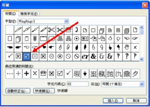 ★舉例:按【插入】、【符號】選字型Wingdings2。很多常用的在其中,請看上圖。