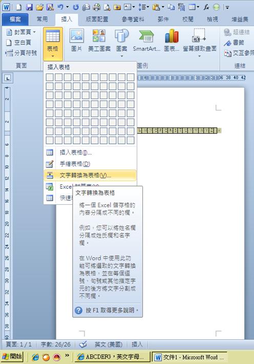 2. 按【插入】、【表格】、【文字轉換為表格】