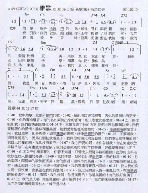 劉瑞國弟兄,愛唱歌,唱的都是詩歌,會吉他,能自彈自唱,他認為【雅歌是歌中之歌】,既然是歌,就可以唱,因古調失傳,不能唱,由於此,他用【新歌誦詠-箭之歌-曲】譜,將雅歌八章,以每章為單元,取其金句,濃縮為三節,填入譜中,唱起來不失原旨。他未上網,余為代勞,與弟兄姊妹分享。