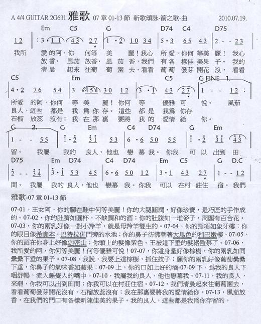 劉瑞國弟兄,愛唱歌,唱的都是詩歌,會吉他,能自彈自唱,他認為【雅歌是歌中之歌】,既然是歌,就可以唱,因古調失傳,不能唱,由於此,他用【新歌誦詠-箭之歌-曲】譜,將雅歌八章,以每章為單元,取其金句,濃縮為三節,填入譜中,唱起來不失原旨。他未上網,余為代勞,與弟兄姊妹分享。