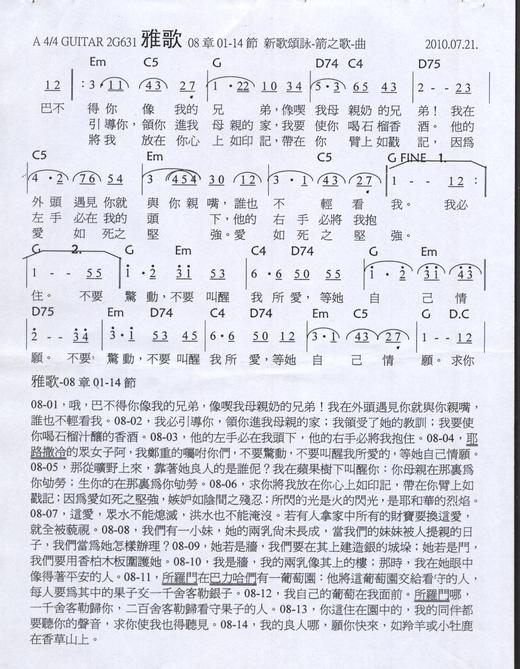劉瑞國弟兄,愛唱歌,唱的都是詩歌,會吉他,能自彈自唱,他認為【雅歌是歌中之歌】,既然是歌,就可以唱,因古調失傳,不能唱,由於此,他用【新歌誦詠-箭之歌-曲】譜,將雅歌八章,以每章為單元,取其金句,濃縮為三節,填入譜中,唱起來不失原旨。他未上網,余為代勞,與弟兄姊妹分享。