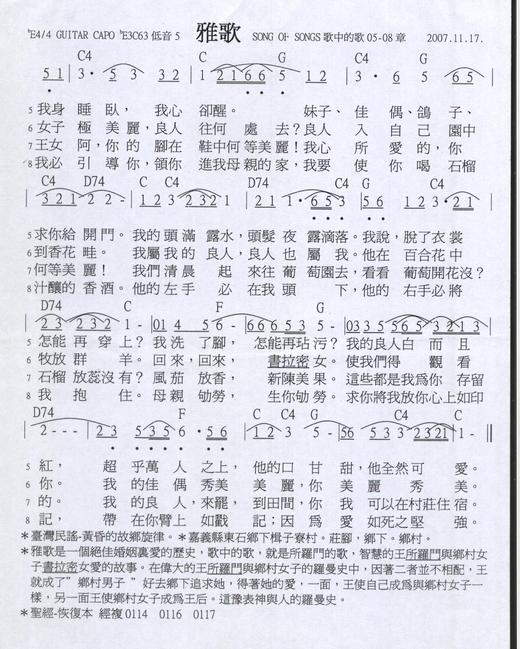 劉瑞國弟兄,愛唱歌,唱的都是詩歌,會吉他,能自彈自唱,他認為【雅歌是歌中之歌】,既然是歌,就可以唱,因古調失傳,不能唱,由於此,他用【新歌誦詠-箭之歌-曲】譜,將雅歌八章,以每章為單元,取其金句,濃縮為三節,填入譜中,唱起來不失原旨。他未上網,余為代勞,與弟兄姊妹分享。