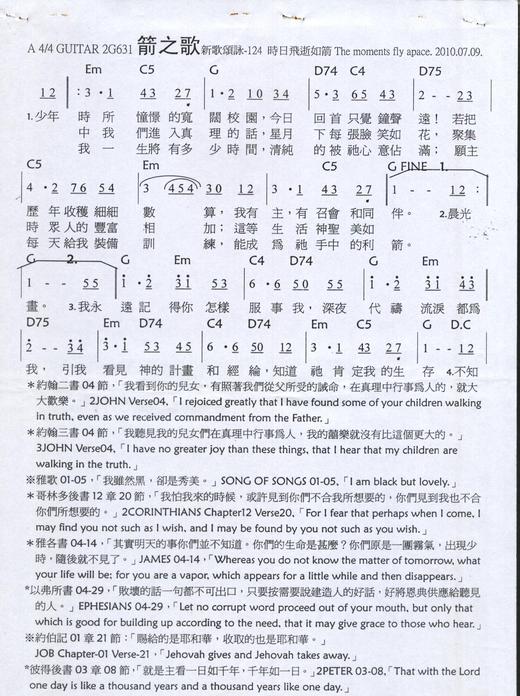 劉瑞國弟兄,愛唱歌,唱的都是詩歌,會吉他,能自彈自唱,他認為【雅歌是歌中之歌】,既然是歌,就可以唱,因古調失傳,不能唱,由於此,他用【新歌誦詠-箭之歌-曲】譜,將雅歌八章,以每章為單元,取其金句,濃縮為三節,填入譜中,唱起來不失原旨。他未上網,余為代勞,與弟兄姊妹分享。