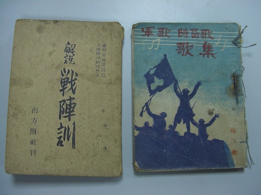 古書蒐藏家邱素慧收藏了父親邱旺生先生閱讀過的古典小說「五虎平西」等書外,也珍藏了「解說戰陣訓」、「軍歌時局歌歌集」,這些書至少有五十年的歷史,其中的「解說戰陣訓」一書,從封面上「台灣軍報道部閱,皇國精神研究會著」的字樣,可以推測出版於日據時代。
