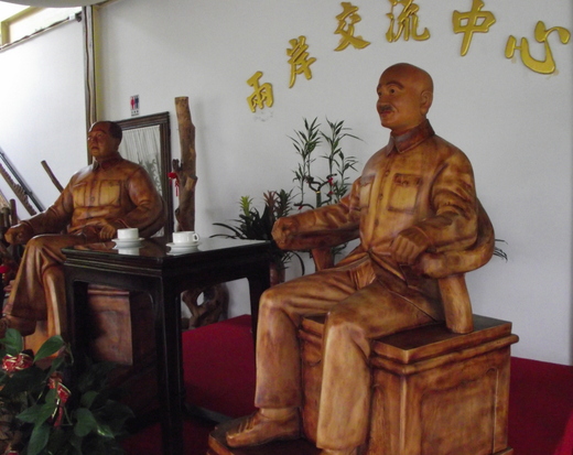業者看準陸客來台的龐大商機,斥資120萬元聘請木雕師傅打造兩尊雕像,一尊是蔣中正,另一尊是毛澤東,兩人並肩而座,讓許多遊客大開眼界,也成餐廳的鎮店之寶,見證了兩岸交流的歷史。店長謝求香表示,這兩尊雕像不僅一體成形,更是按照原版的1比1尺寸打造而成。餐廳取名「兩岸交流中心」,同時設計了拍照舞台,讓遊客可以隨心所欲的和這兩位歷史人物合照留念。