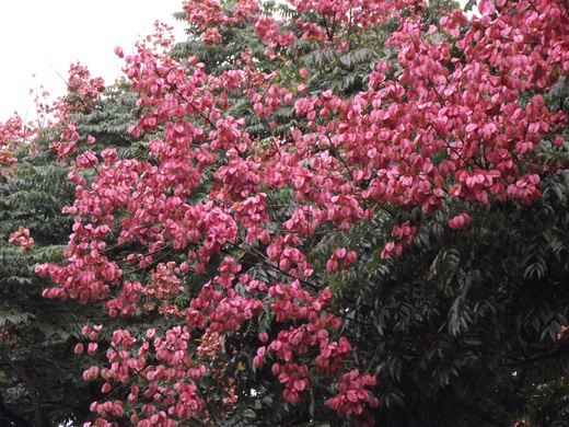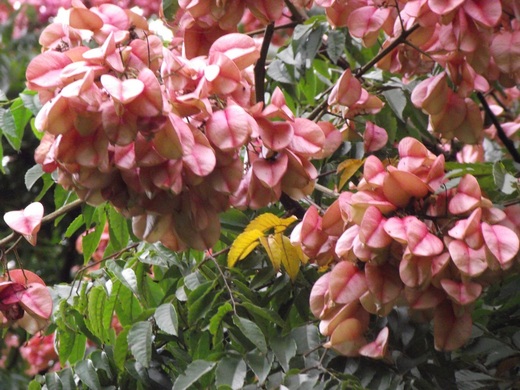 有「台灣金雨樹」之稱的台灣欒樹,生命力強、生長速,是理想的行道樹樹種,每年10月間,都會盛開細小的黃色星狀,點綴著一點紅心,隨著秋風成群灑落在一地。小黃花串凋謝後,會立刻結成一串串三稜狀氣囊的蒴果,顏色變化交替,由紅磚色轉淡粉、淺褐,入冬轉深咖啡色,蒴果會自動迸開。