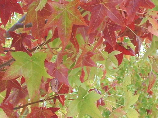 而前門階前的楓樹正在不聲不響進行著由綠轉紅的工程﹐前幾天只有寥寥幾片紅葉﹐今天出去一看﹐已經染紅一半。從太陽升起的那一端看過來﹐是碧綠一色﹐走到另外一邊﹐看見的是紅綠斑駁。再過不久就要紅透半條街了。