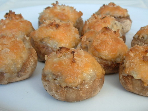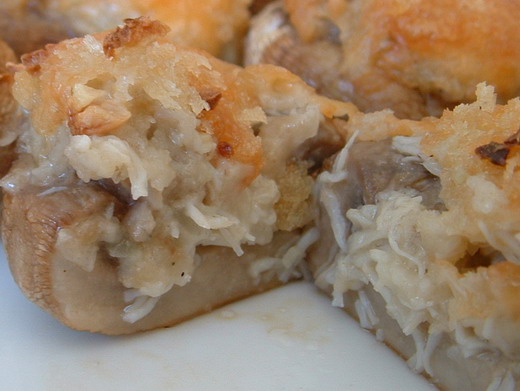 不過可以買煮熟冷凍過的螃蟹﹐或者買螃蟹肉罐頭。我也用過假螃蟹肉(已經切碎的那種)再加一些剁碎的蝦仁﹐也挺受歡迎。還可以做成素食烤蘑菇﹐只用洋蔥、芹菜、蘑菇蒂…﹐不加海鮮。鑲蘑菇的材料有很多的變化。