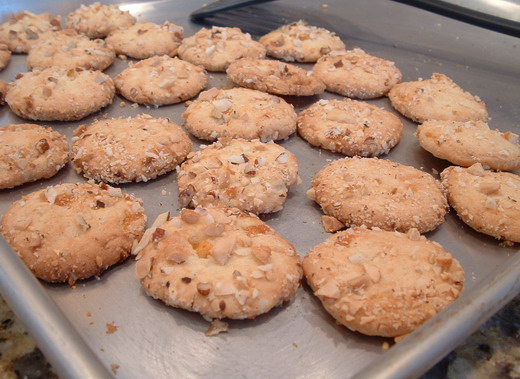 外表滾一層碎堅果(optional) 切薄片後一面蘸碎堅果 - 烤箱預熱400°F(200°C)。24片餅﹐烤至金黃﹐約13至15分鐘。