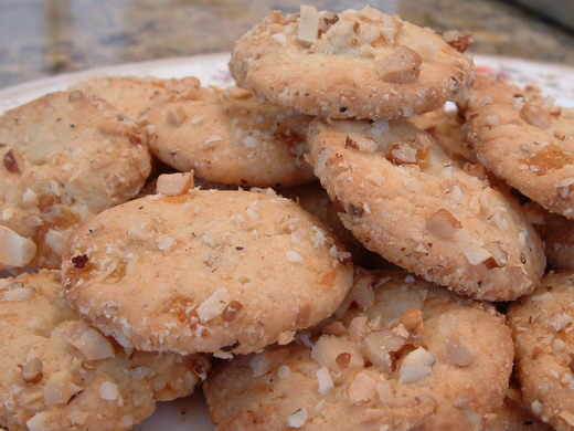 我的小餅乾食譜用之多年﹐變換過多種不同口味﹐像是巧克力、檸檬、杏仁、櫻桃乾、草莓乾、洋李乾…… 現在最常做的只有兩種﹕小紅莓和杏果。外面還裹上切碎的堅果或芝麻。