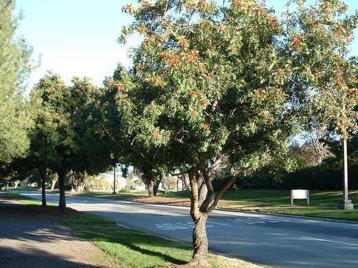 車輛往來頻繁的大馬路邊有一排巴西胡椒樹。它像梅花一樣﹐在寒冷的冬天開花﹐白色小花如芝麻粒般渺小﹐眼睛湊近都看不清楚。但是可以聞到淡淡的胡椒香氣﹐香氣來自墨綠色的羽狀葉子。串串鮮紅色漿果掛在繁茂的枝葉間﹐吸引我的注意力。